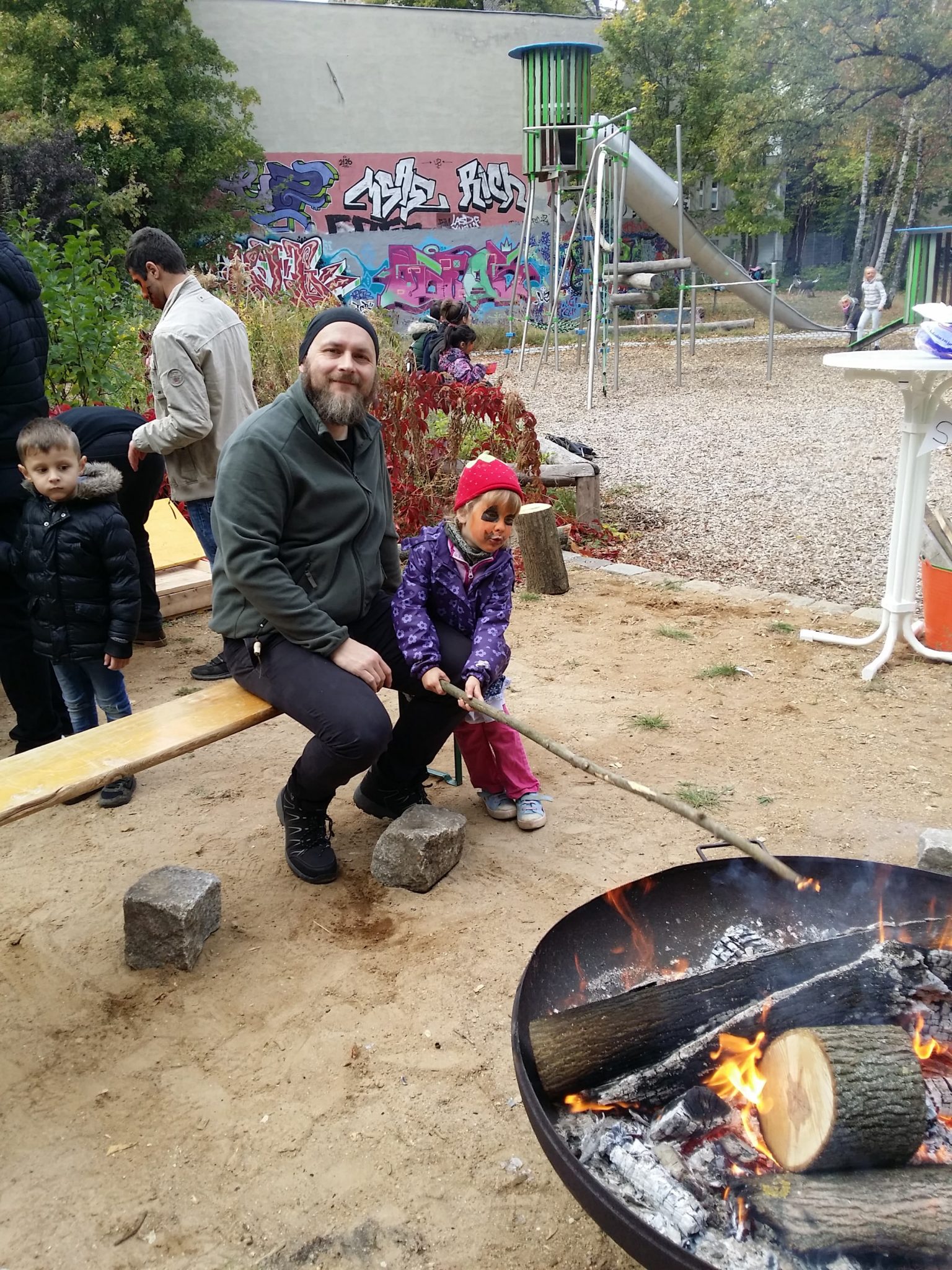 Ein Fest der besonderen Art ist das Kürbis-Fest, denn hier arbeiten viele Initiativen, Vereine und Projekte zusammen und es wurde ein kuscheliger, angenehmer Nachmittag im Großstadtgrün! Die Luthergemeinde, BDP Koeltze, BDP Mädchenladen, Nachbarschaft aktiv, Eulalia Eigensinn, die Neustadt-Oasen, das Paul-Schneider-Haus, Spax, die Lebenshilfe e.V., das Neustädter Lesezelt, der SNNEV, Birikim … viele Aktive sorgten für ein rundum gelungenes Fest! Da wurde gehämmert für ein Stück Kuchen, gemalt, Kürbisse geschnitzt, literweise leckere Kürbissuppe gegessen, Musik gemacht, Bücher verkauft (und signiert), Marmelade, Sirups und Säfte feil geboten, Smoothies kritisch verkostet, geschminkt, getratscht und gelacht, gespielt und der Nachmittag einfach genossen. Niemand, der nicht wenigstens auf ein Stück Kuchen hängen geblieben wäre … Zünftig war es auch an der Feuerschale, wo Jung und Alt Stockbrot rösteten und gegen Ende die verfrorenen Akteure sich noch ein wenig aufwärmen konnten.